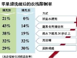實(shí)驗(yàn)結(jié)果:實(shí)驗(yàn)人員介紹,從本次實(shí)驗(yàn)看,鹽水浸泡后再?zèng)_洗,蘋果的農(nóng)殘抑制率直接從21%降為零,效果最明顯。其次是專門的果蔬清潔劑,去除農(nóng)殘也還不錯(cuò)。另外,流水下直接搓洗,也能在一定程度上幫助去除農(nóng)殘。但選用洗潔精以及水中加入面粉揉搓,效果并不明顯。