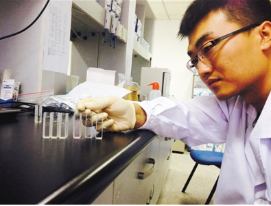 隨后,實(shí)驗人員把裝有樣品液的比色皿放到檢測儀器中檢測讀數(shù),數(shù)值顯示在電腦屏幕上。