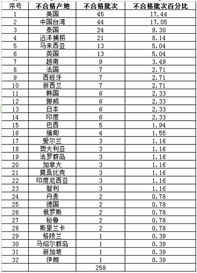 新華食品統計發現,2013年10月至2014年11月國家質檢總局公布不合格肉制品名單中,美國、中國臺灣、泰國分別以檢出45批次、44批次、24批次列第一、第二、第三,所占不合格肉制品批次分別為17.44%、17.05%、9.30%。其中美國以檢出45批次占近1/5居首位。