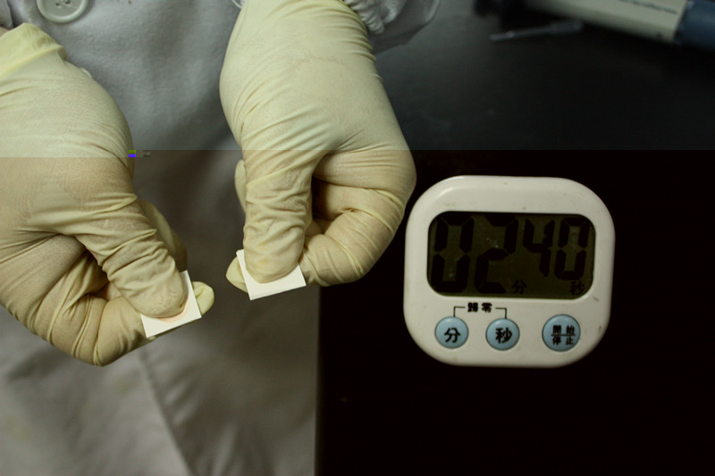 3. 取2片農殘卡,分別往白色藥片上滴上樣品提取液和蒸餾水,放置 10min。