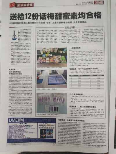 2016年8月25日12:00,北京智云達科技股份有限公司(以下簡稱“北京智云達”)與法制晚報在樂嗨直播話梅中甜蜜素和二氧化硫的檢測。