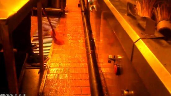 記者隨即被分配到廚房做一名配菜員,負責配置醬料和菜品原料。記者發現,廚房墻面和地面常常積累了污水和油漬,為了保潔,廚房師傅便不定期對墻面和地面進行刷洗和清掃,而在清掃之后,廚房師傅竟將掃把放入用于做菜的鍋內進行漂洗。見記者表情驚訝,旁邊的一名廚房師傅不以為然地說:“這里本來就是掃把洗鍋啊!”