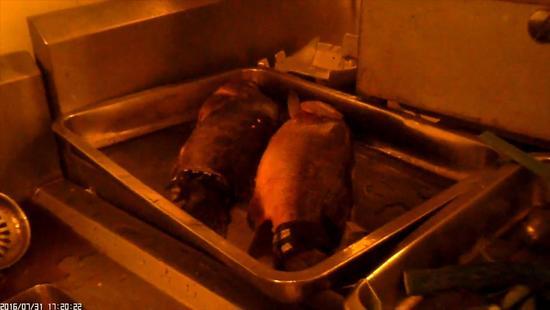 而蹲守在廚房的記者發現,配菜員接到點菜信息后從冰柜里取出一條死亡已久的鱸魚送到廚房并進行烹飪。不多久,這條死鱸魚便成了一道絢麗奪目的“松鼠桂魚”菜肴。