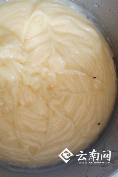 現場:原料堆放廁所門外,煉乳中有蒼蠅。這間用于生產面包的車間十分簡陋,部分生產原料直接堆放在衛生間門外,而在一盆淺黃色的煉乳中,能清晰地看見有兩只蒼蠅吸附在上面,做好的面包片隨意存放在一鐵架上,且沒有任何的防護措施。面包夾心和面包屑散落一地,面包加工設備銹跡斑斑,還有一大袋食品添加劑“甜蜜素”被執法人員拿在手中。