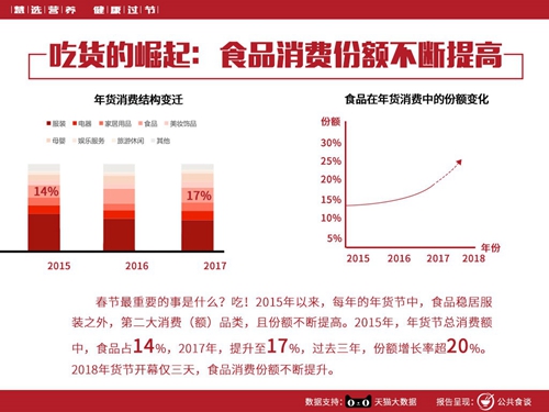 科信食品與營養信息交流中心副主任、食品與營養科學傳播聯盟副秘書長鐘凱表示:“六家專業機構正是基于大數據揭示的食品消費趨勢,制作了‘慧選營養,健康過節’——2018春節食品消費建議,并希望通過天貓等互聯網年貨消費平臺,倡導公眾智慧選購食材,保持膳食均衡,飲食適度適量,并將健康的飲食習慣帶給自己的家人?!?