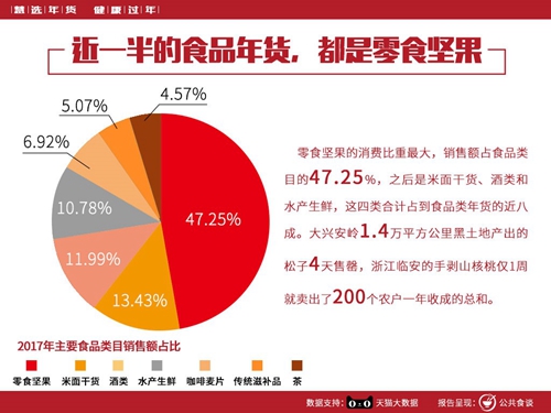 大數據顯示,在食品類的年貨消費上,零食堅果消費量最大,占比高達47.25%。也就是說,現代人買年貨,在吃方面,近一半的錢花在以各色堅果為代表的零食上。