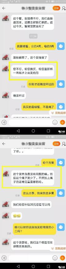 我又問對方的客服,是否可以保證按訂單的貨發給我,對方直接告訴我,說明上已經明確告知,螃蟹是含繩子的分量的,寄回去以后,會多綁幾根繩子,保證不缺份量再寄給我,無圖無真相,我把螃蟹的照片和與對方的客服的對話發上來。
