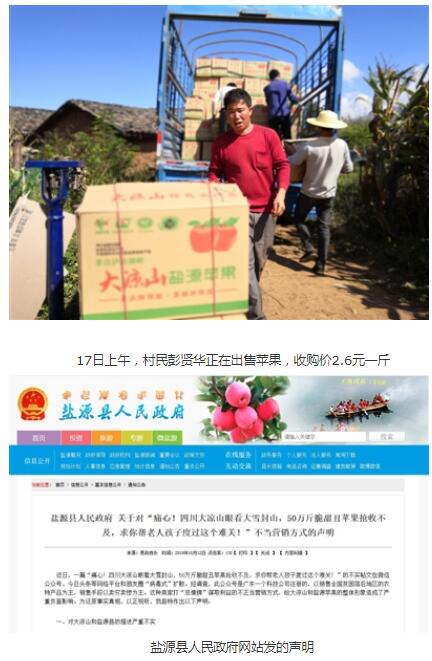 這篇名為《痛心!四川大涼山眼看大雪封山,50萬斤脆甜丑蘋果搶收不及,求你幫老人孩子渡過這個難關!》的帖文,配發了數十張照片,多數都是老人、小孩的照片,文字描述得十分悲慘,將鹽源蘋果描述為“丑蘋果”。內容稱,因為天災頻繁,交通不便,蘋果難以運出山里進行售賣,收購價被壓到兩三毛錢一斤?!班l親們也無奈,他們條件不足,越早摘越能賣個好價錢,只能讓收購商低價收走。我們不忍心跟他們說,山外的原生態蘋果往往都能賣出十幾元一斤。”