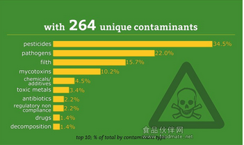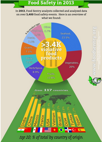 統計數據還顯示,出問題的食品包括:海鮮(23.5%)、蔬菜(20%)、水果(13.8%)、香菜/調味品(8.9%)、乳品(7.5%)。食品違規類型包括農殘(34.5%)、病菌(22.0%)、污物(15.7%)、真菌毒素(10.2%)、化學物質/添加劑(4.5%)。