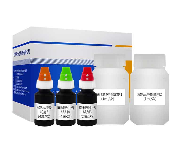 食品在加工過程中往往添加膨松劑硫酸鋁鉀或硫酸鋁銨,使用量較大,鋁的含量可能會超過國家有關食品標準。鋁通過食物進入人體,在體內蓄積,會損害腦細胞,是老年癡呆的病因之一。同時影響鐵、鈣等成分的吸收,導致骨質疏松,貧血,甚至影響神經細胞的發育。目前我國面制食品中鋁的最大允許量為 100 mg/kg。食品中鋁與顯色試劑形成藍色物質。本速測盒適用于面制品中鋁的快速檢測。