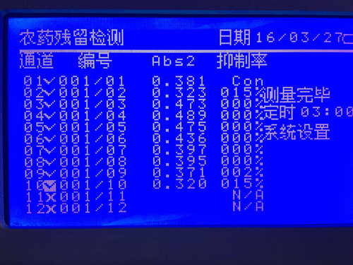 檢測(cè)結(jié)果如圖所示,結(jié)果以酶被抑制的程度,即抑制率表示。當(dāng)果蔬樣品提取液對(duì)酶的抑制率為40~50%時(shí),則表明被測(cè)樣品為可疑農(nóng)殘超標(biāo)樣品;當(dāng)抑制率≥50%時(shí),表示蔬菜中有高劑量有機(jī)磷或氨基甲酸酯類農(nóng)藥存在,樣品為陽性結(jié)果。所以樣品中農(nóng)藥殘留符合國家標(biāo)準(zhǔn)。